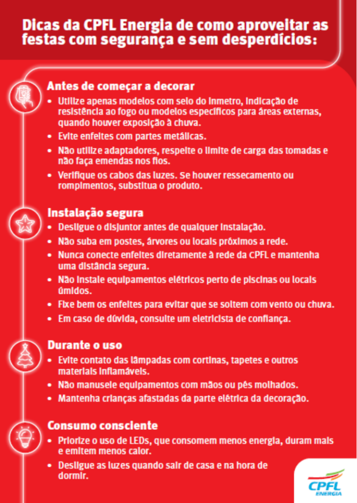 Outra dica é estar atento a fiação interna dos imóveis. “Antes de decorar, é fundamental revisar a instalação elétrica com um profissional habilitado e verificar o estado dos enfeites utilizados em anos anteriores”, orienta Raphael Campos, gerente de Saúde e Segurança da CPFL Energia.