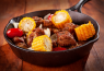 Em um refratário médio, adicione o as costelinhas e os milhos. Se preferir, salpique cheiro verde ou alecrim.
